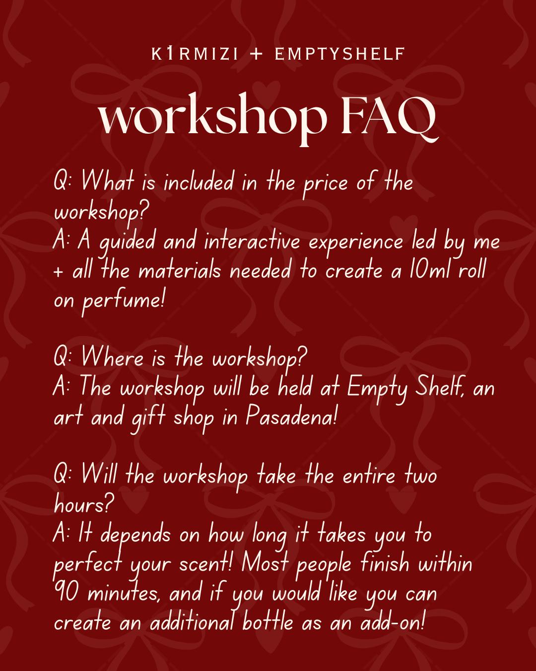 Join us at Empty Shelf for a hands-on, interactive perfume workshop with artist k1rmizi. Blend different fragrances to craft a roll-on perfume that reflects your personality.