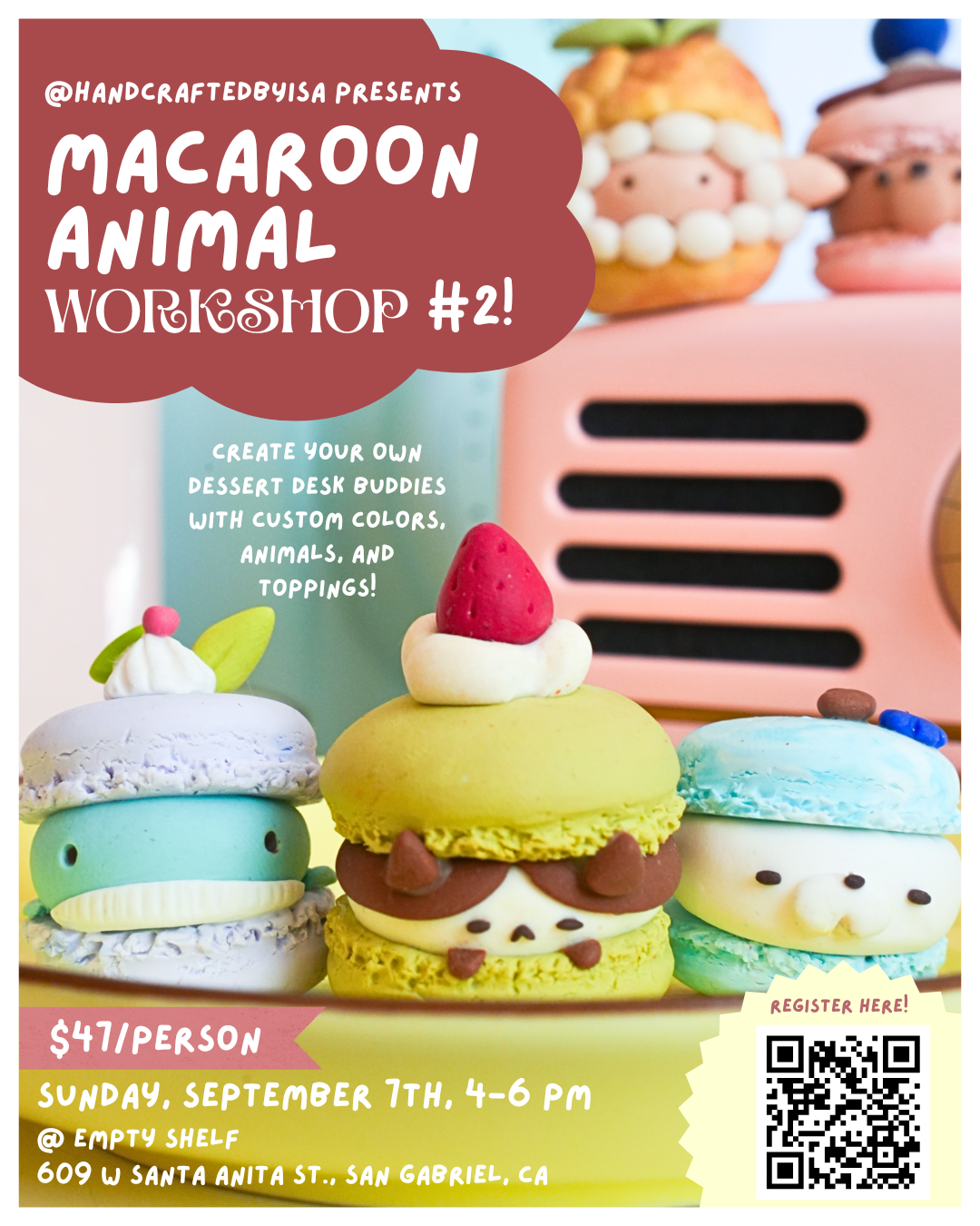 In this two-hour workshop, youβll learn how to use FIMO and Sculpey polymer clay to create 1β2 customizable macaroon animals β pick your favorite flavors, animals, and toppings. No prior experience needed β weβll guide you step by step!